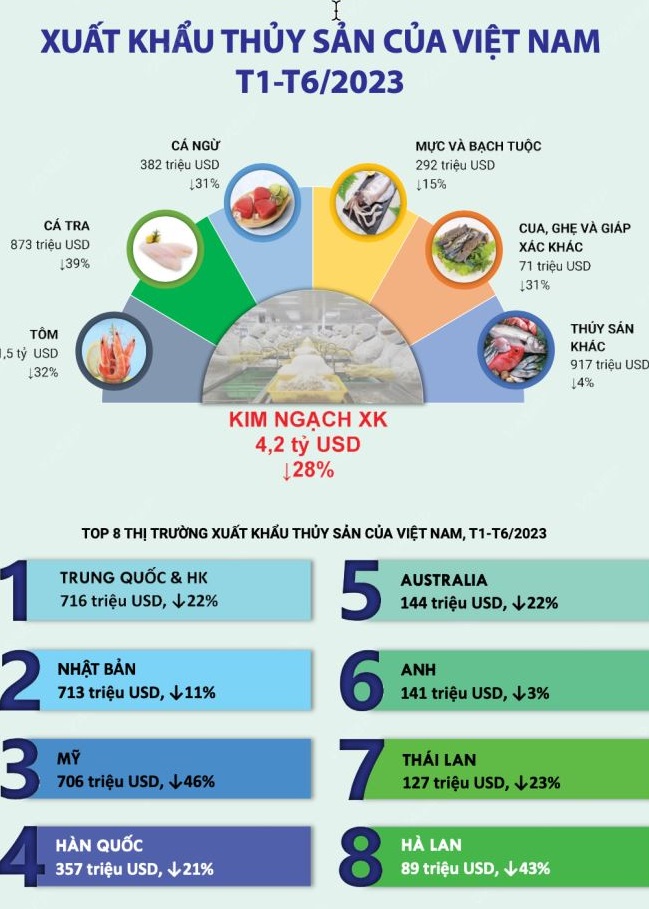 Theo số liệu thống kê của Hải quan Việt Nam, xuất khẩu thủy sản của Việt Nam vẫn tiếp tục sụt giảm trong tháng 6/2023. Do đó, tính lũy kế 6 tháng đầu năm, kim ngạch XK giảm 28%, đạt 4,2 tỷ USD. So với cùng kỳ năm 2022, XK các nhóm mặt hàng của Việt Nam đều giảm so với cùng kỳ.