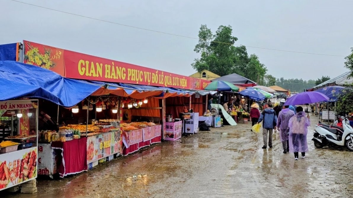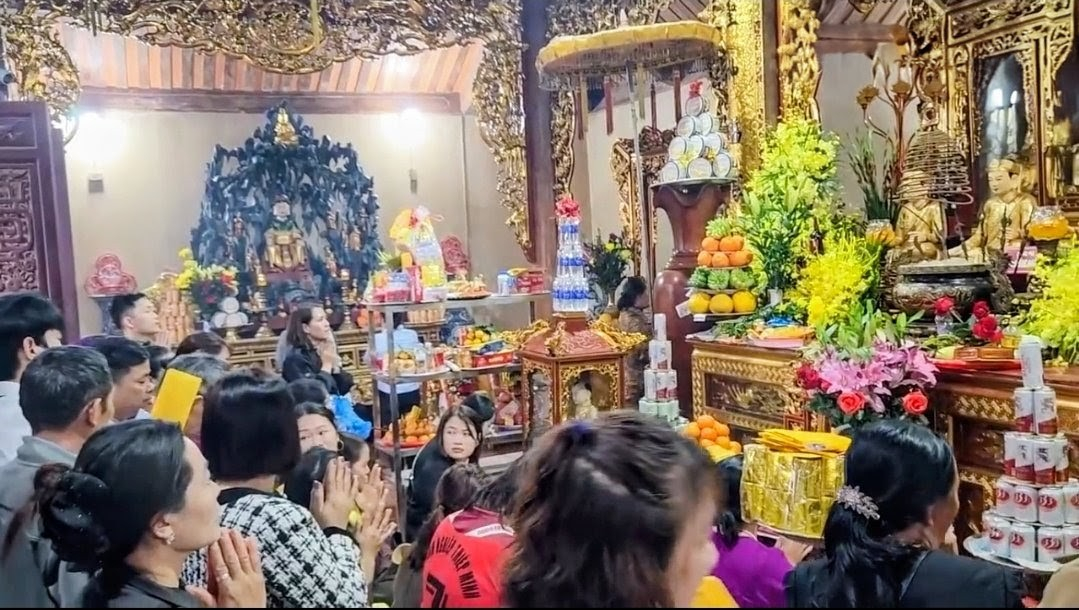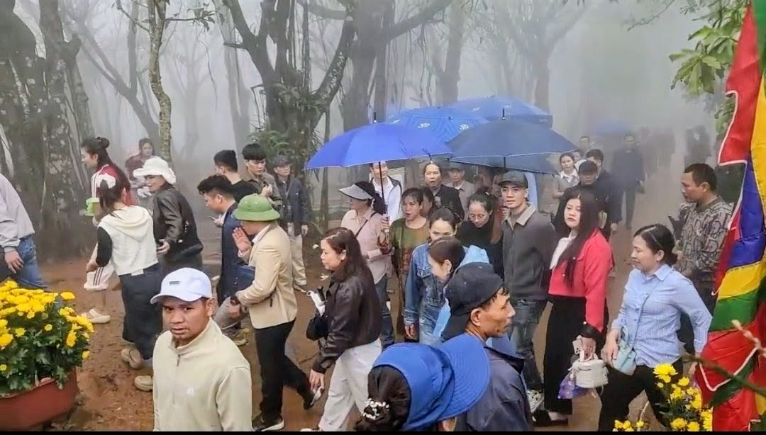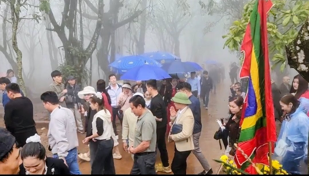 Từ sáng sớm, dù thời tiết có mưa phùn và sương mù dày đặc đặc trưng của tiết xuân miền Bắc, dòng người hành hương vẫn nối dài trên con đường núi quanh co dài gần 3km. Nhiều người mang theo lễ vật giản dị như hoa, hương, bánh trái, thể hiện lòng thành kính khi bước vào không gian linh thiêng.