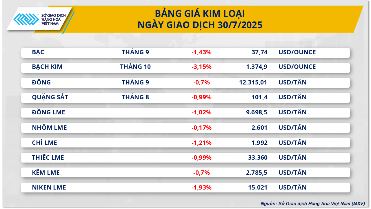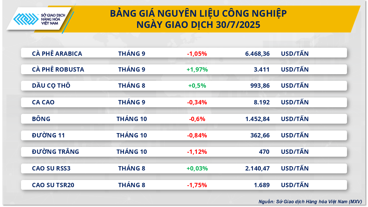 Theo Sở Giao dịch Hàng hóa Việt Nam (MXV), tâm lý thận trọng tiếp tục bao phủ lên thị trường hàng hóa nguyên liệu thế giới trong phiên giao dịch 30/7 sau khi Tổng thống Mỹ Donald Trump bất ngờ áp thuế bổ sung 40% với hàng hóa Brazil, nâng tổng mức thuế lên 50%.