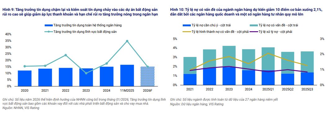 Năm 2026, tăng trưởng tín dụng toàn hệ thống chậm lại với mục tiêu điều hành ở mức khoảng 15%, thấp hơn đáng kể so với mức thực hiện 19% của năm 2025 – cùng với việc kiểm soát tín dụng chảy vào các dự án bất động sản rủi ro cao sẽ giúp giảm áp lực thanh khoản và hạn chế rủi ro tăng trưởng nóng trong ngắn hạn. Tỷ lệ nợ có vấn đề của ngành ngân hàng dự kiến giảm khoảng 10 điểm cơ bản, xuống mức 2,1%. Các ngân hàng quy mô lớn và công ty chứng khoán được kỳ vọng sẽ duy trì ổn định, nhờ môi trường kinh doanh trong nước và các chính sách hỗ trợ của Chính phủ.