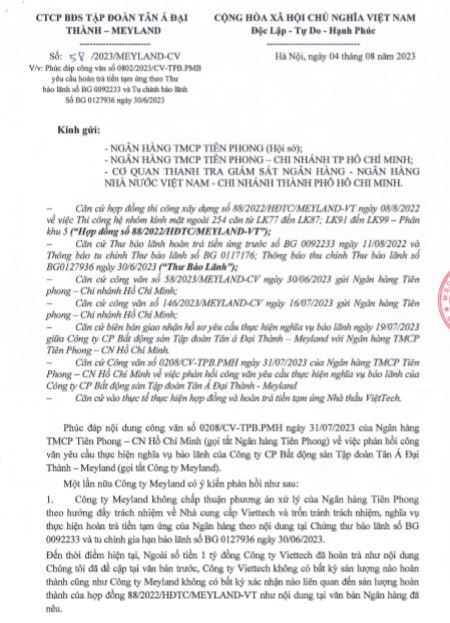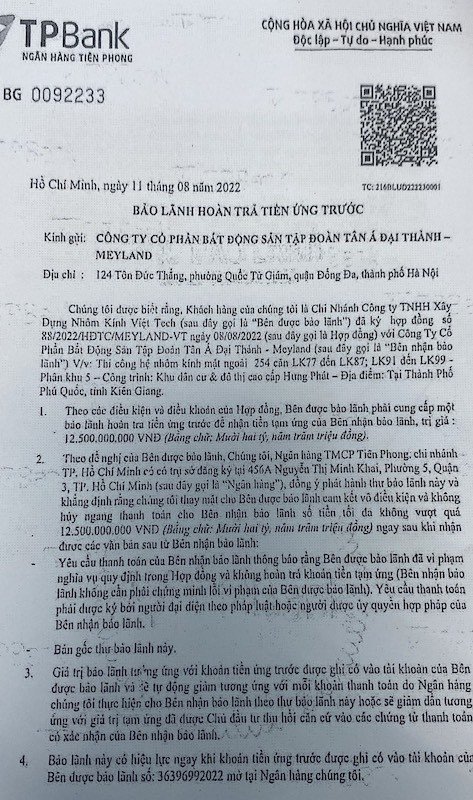 Vừa qua, công ty Bất động sản Tân Á Đại Thành – Meyland cho biết ngân hàng TPBank chi nhánh TP Hồ Chí Minh đã không thực hiện đúng cam kết, kéo dài thời gian thanh toán, hoàn trả tiền tạm ứng cho khách hàng theo nghĩa vụ thanh toán tại chứng thư bảo lãnh tiền tạm ứng.
