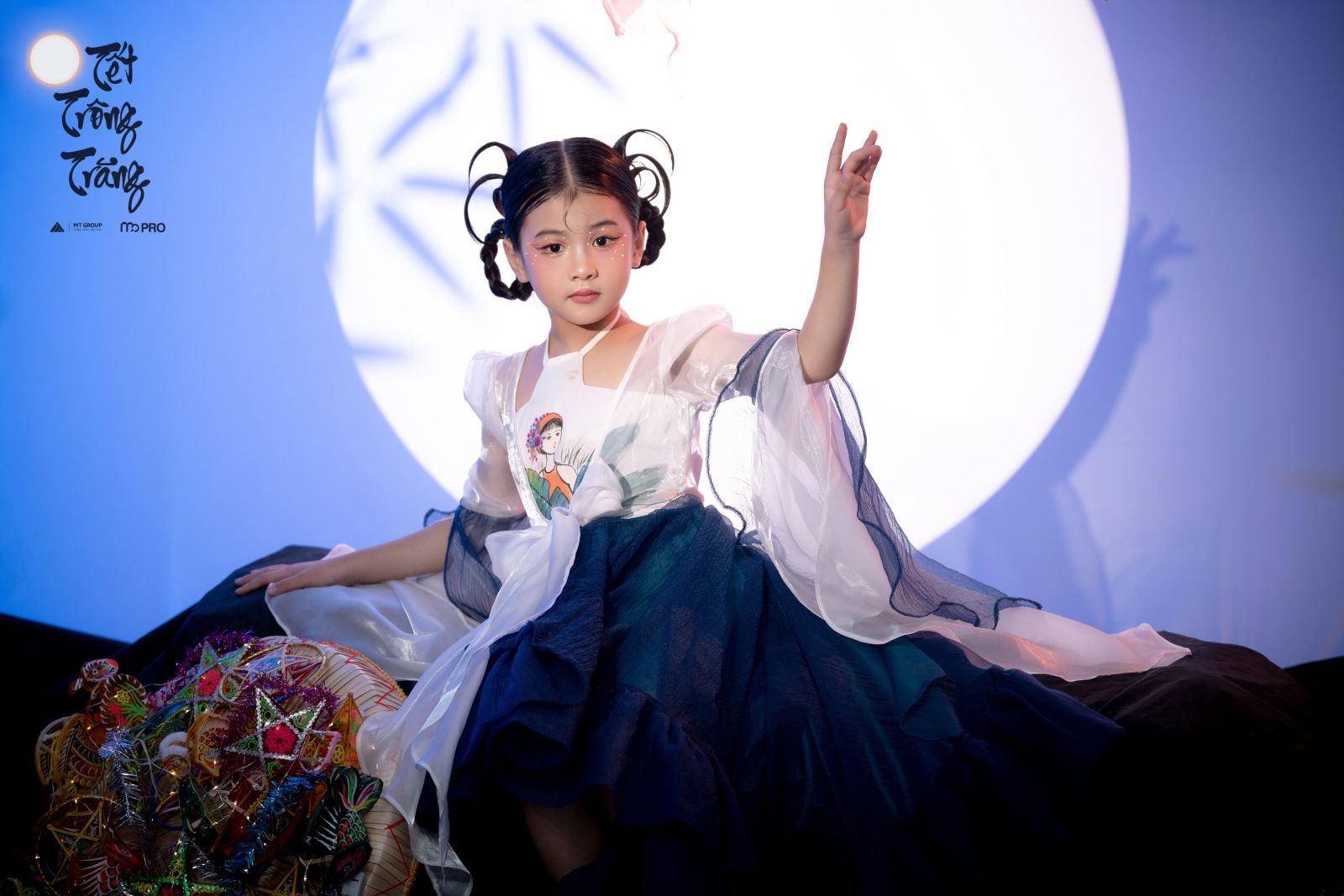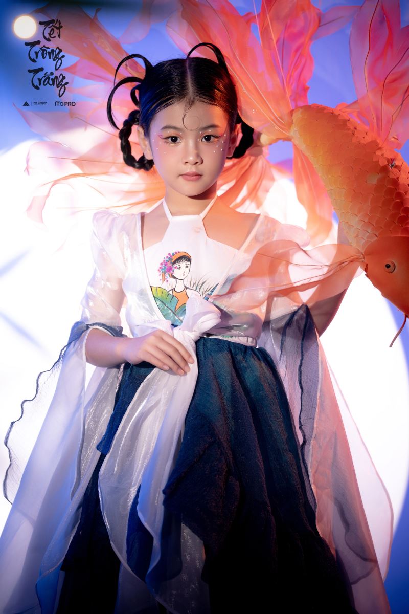 Không chỉ mang vẻ đẹp dân tộc, mẫu nhí Hán Kim Ngân còn thể hiện thần thái chuẩn model qua từng bức ảnh. Với ánh mắt trong trẻo, nụ cười duyên dáng và phong thái tự tin, Kim Ngân đã biến hóa phong phú trong mỗi khung hình, đem lại cảm xúc mới lạ và chân thực cho người xem. Mỗi bức ảnh từ concept "Tết Trông Trăng" đều như kể một câu chuyện, gợi nhớ những kỷ niệm tuổi thơ với ánh trăng rằm và tiếng trống lân náo nức.