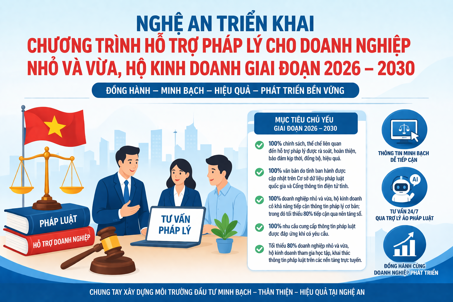 Chương trình hỗ trợ pháp lý giai đoạn 2026-2030 của Nghệ An hướng tới hoàn thiện thể chế đồng bộ, tăng cường minh bạch và hỗ trợ thiết thực cho doanh nghiệp.