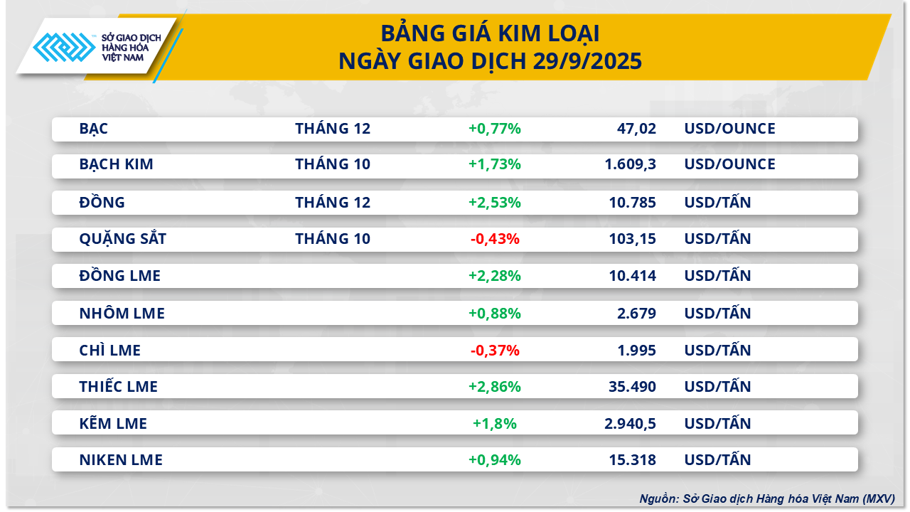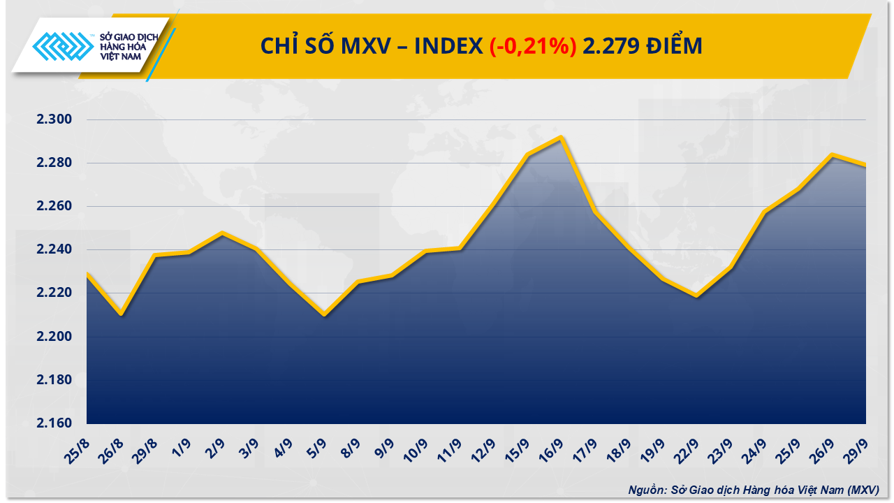 Thị trường hàng hóa toàn cầu chững lại sau chuỗi 5 phiên khởi sắc, khi MXV-Index mất hơn 0,2% xuống 2.279 điểm trong phiên giao dịch đầu tuần  (29/9). Năng lượng dẫn dắt đà giảm với giá dầu thô lao dốc tới 3% trước tín hiệu nguồn cung cải thiện. Trong khi đó, đồng hưởng lợi từ đà suy yếu của USD và lo ngại thắt chặt nguồn cung, ghi nhận phiên tăng thứ hai liên tiếp.