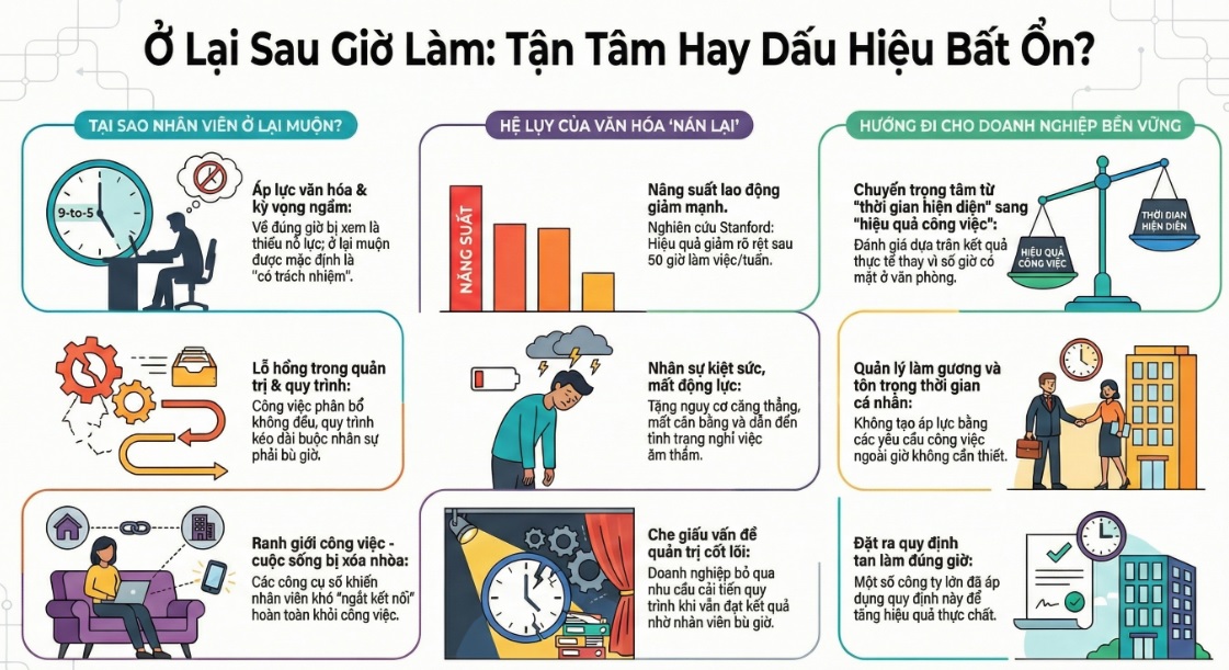 Đáng chú ý, việc nhân sự thường xuyên ở lại sau giờ làm cũng có thể che giấu những vấn đề quản trị cốt lõi. Khi kết quả vẫn đạt được nhờ sự hy sinh thời gian cá nhân, doanh nghiệp dễ bỏ qua nhu cầu cải tiến quy trình, tái cấu trúc công việc hay đầu tư công nghệ. Về lâu dài, chi phí cơ hội của việc không thay đổi có thể lớn hơn nhiều so với lợi ích ngắn hạn từ việc “làm thêm giờ không chính thức”.