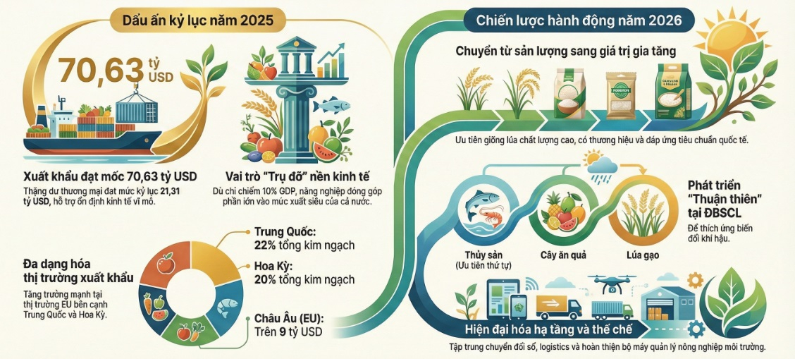 Ngành nông nghiệp Việt Nam tiếp tục khẳng định vai trò trụ đỡ của nền kinh tế với kết quả xuất khẩu nông, lâm, thủy sản năm 2025 đạt 70,63 tỷ USD.