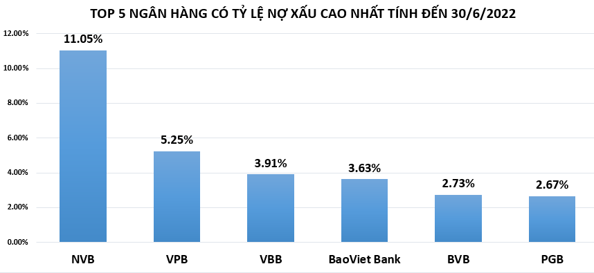 Top 5 ngân hàng có tỷ lệ nợ xấu cao nhất tính đến cuối quý 2/2022 bao gồm: NCB, VPBank, Vietbank, BaoViet Bank, Viet Capital Bank, PGBank. Nếu ngân hàng không kiểm soát được tỷ lệ nợ xấu dưới mức 3% sẽ bị giới hạn nhiều hoạt động như không được mua trái phiếu doanh nghiệp,…