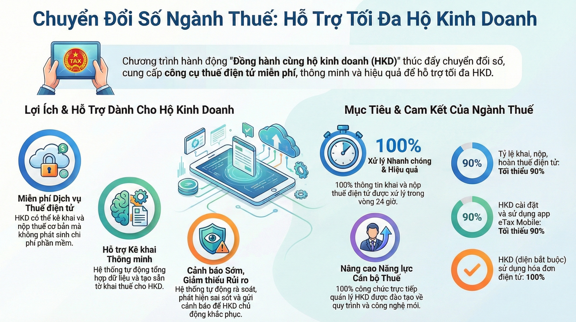 Mục tiêu trọng tâm là đạt tỷ lệ 90% các giao dịch thuế được thực hiện trực tuyến và 100% hộ kinh doanh bắt buộc phải sử dụng hóa đơn điện tử khởi tạo từ máy tính tiền. Bên cạnh việc nâng cấp công nghệ, ngành Thuế cũng sẽ kiện toàn bộ máy nhân sự và đào tạo chuyên sâu cho cán bộ để phục vụ người dân chuyên nghiệp và hiệu quả hơn. Những nỗ lực này hướng tới việc xây dựng một nền quản trị thuế minh bạch, công bằng và tạo điều kiện thuận lợi nhất cho cộng đồng kinh doanh cá thể.