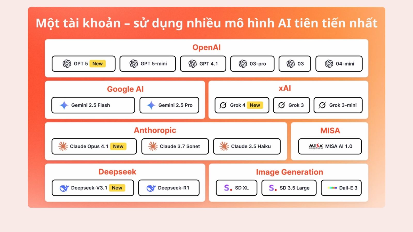 Điểm đặc biệt của nền tảng này là khả năng tích hợp nhiều mô hình AI nổi tiếng trên thế giới như ChatGPT, Gemini, Grok, DeepSeek hay Claude, đồng thời cung cấp cơ chế so sánh kết quả để người dùng lựa chọn phương án phù hợp. Điều này mang lại giá trị thực tiễn cho quá trình triển khai AI trong quản trị, sáng tạo nội dung, hoạch định chiến lược hay thậm chí các hoạt động đời sống thường ngày. Việc phổ cập AI không chỉ phục vụ nhu cầu tối ưu hóa hiệu quả sản xuất – kinh doanh, mà còn góp phần hình thành thói quen sử dụng công nghệ trong xã hội, giúp cá nhân, gia đình và doanh nghiệp hòa nhập nhanh hơn với xu thế toàn cầu.