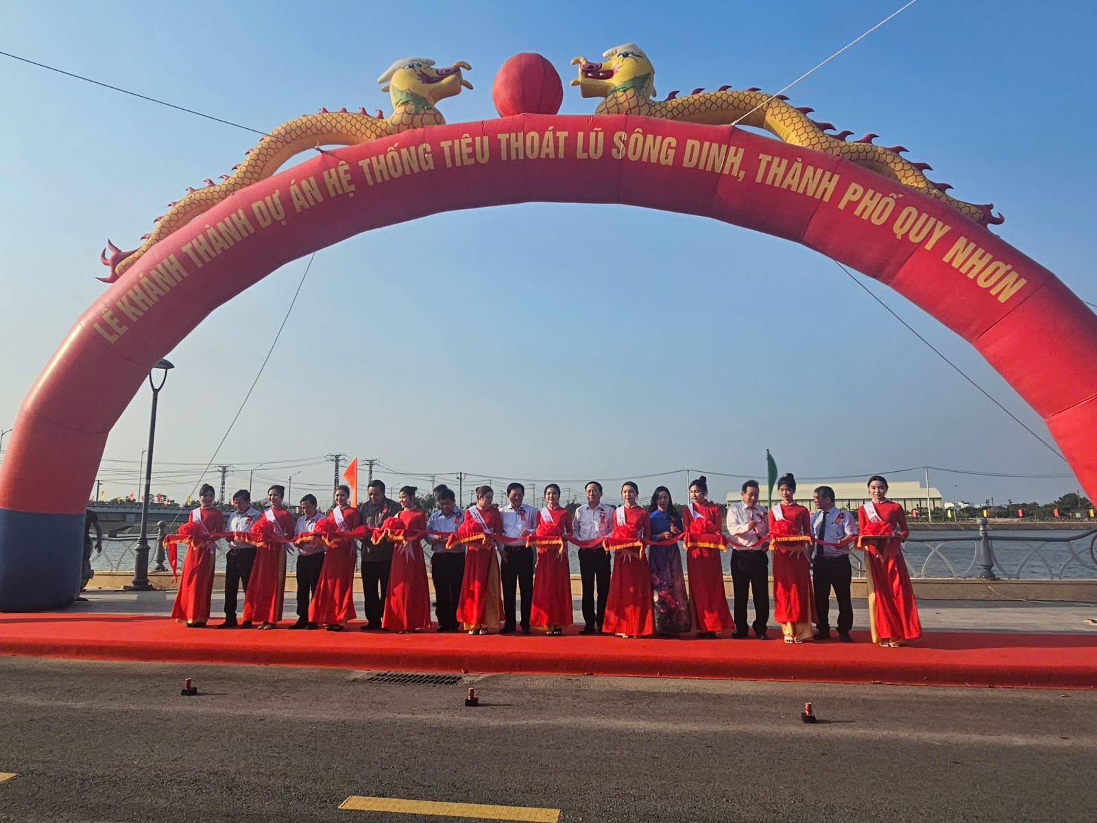 Phó Thủ tướng Nguyễn Chí Dũng cùng các đồng chí lãnh đạo tỉnh Bình Định cắt băng khánh thành dự án Hệ thống tiêu thoát lũ sông Dinh