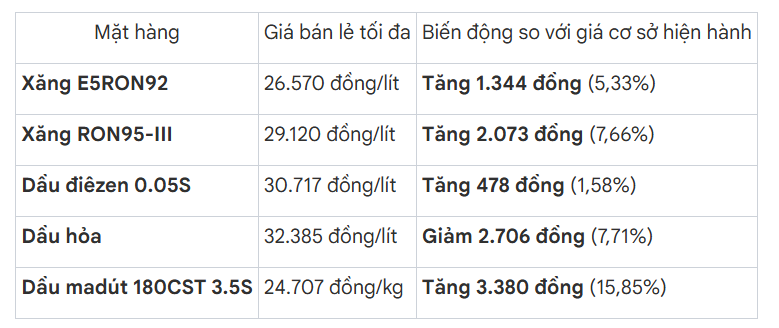 Sau khi áp dụng các biện pháp điều hành, giá bán lẻ tối đa của các mặt hàng xăng dầu đã được điều chỉnh. Xăng E5RON92 được niêm yết ở mức 26.570 đồng mỗi lít, tăng 1.344 đồng so với giá cơ sở hiện hành, tương đương mức tăng khoảng 5,33%.