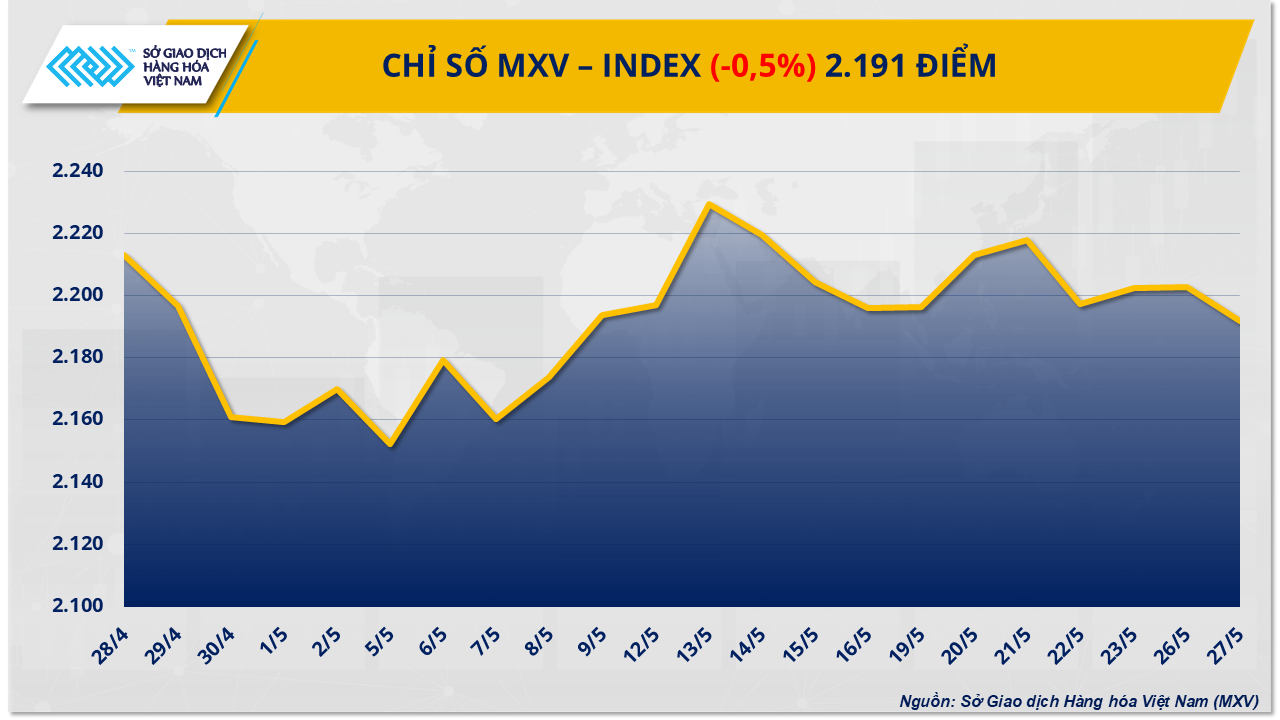 Theo MXV, khép lại phiên giao dịch hôm qua, chỉ số MXV-Index nguyên liệu công nghiệp ghi nhận phiên điều chỉnh giảm nhẹ. Đáng chú ý, giá hai mặt hàng cà phê diễn biến phân hóa rõ nét. Cụ thể, hợp đồng cà phê Arabica giao tháng 7 trên sàn ICE US tăng nhẹ 0,19%, lên 7.974 USD/tấn. Ngược lại, hợp đồng cà phê Robusta giao tháng 7 trên sàn ICE EU giảm sâu 1,96%, xuống còn 4.696 USD/tấn – mức thấp nhất trong vòng 7 tuần trở lại đây.