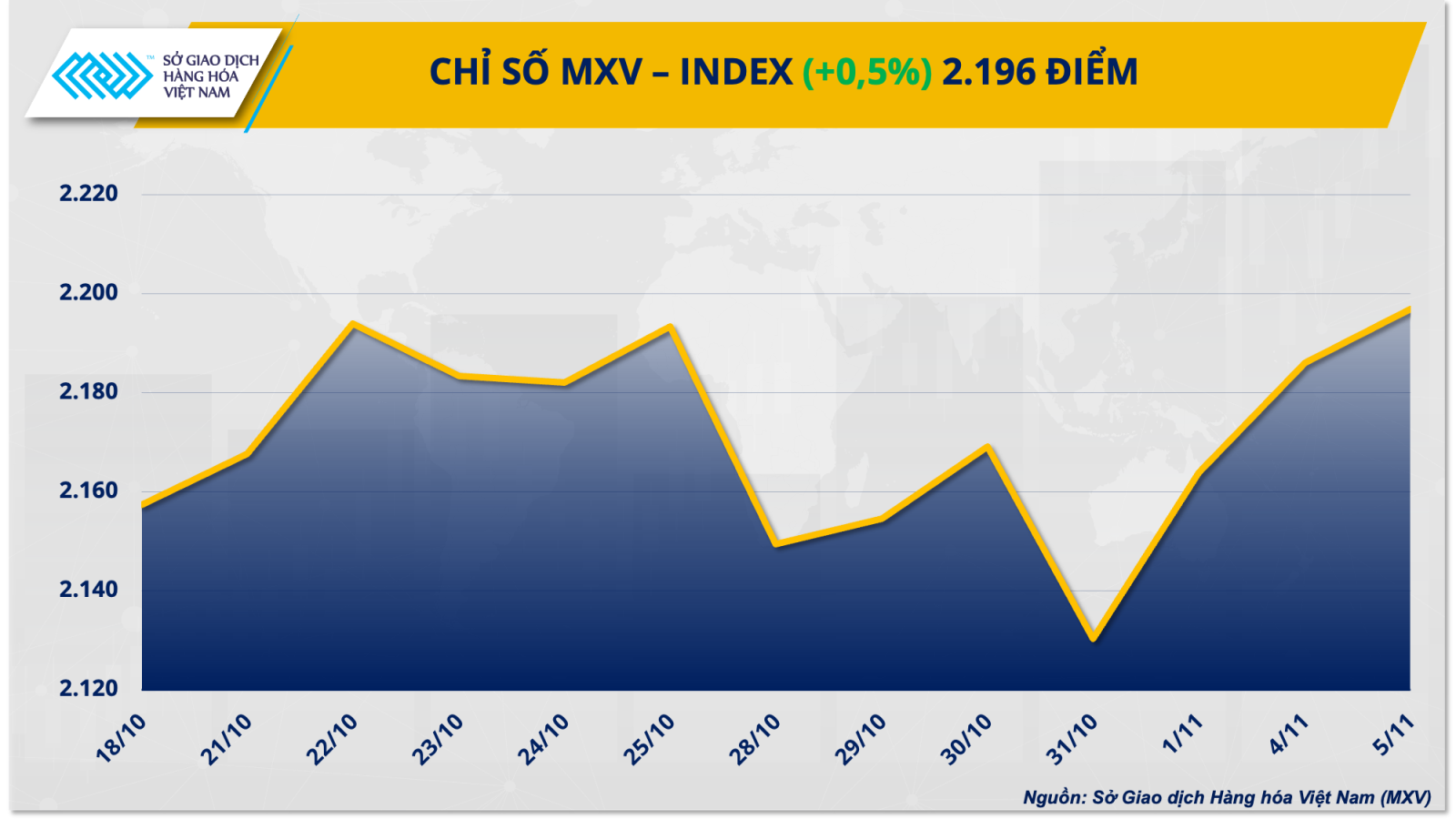 Theo Sở Giao dịch Hàng hóa Việt Nam (MXV), lực mua tiếp tục chiếm ưu thế trên thị trường hàng hóa nguyên liệu thế giới trong ngày giao dịch hôm qua (5/11). Đóng cửa, chỉ số MXV-Index tăng 0,5 % lên 2.196 điểm.