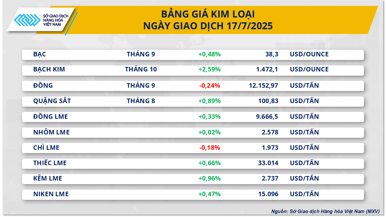 Khép lại phiên giao dịch ngày hôm qua (17/07), thị trường kim loại chứng kiến lực mua áp đảo với 8 trên 10 mặt hàng trong nhóm đồng loạt tăng giá. Trong đó, giá bạch kim tiếp tục tăng thêm 2,6% lên mức 1.472 USD/ounce, mức cao nhất trong hơn 11 năm trở lại đây.