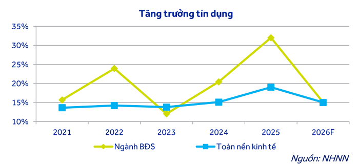 Thứ nhất là thách thức về mặt chính sách. Theo đó, tăng trưởng tín dụng bị siết chặt. Từ đầu năm 2026, NHNN đã yêu cầu các ngân hàng kiểm soát chặt chẽ tăng trưởng tín dụng bất động sản không được vượt quá tăng trưởng tín dụng chung của nền kinh tế dự kiến là 15%. Nguyên nhân là do năm 2025 tăng trưởng tín dụng của ngành này ở mức rất cao (32%) so với mức 20,4% của năm 2024 và 19% của toàn nền kinh tế.
