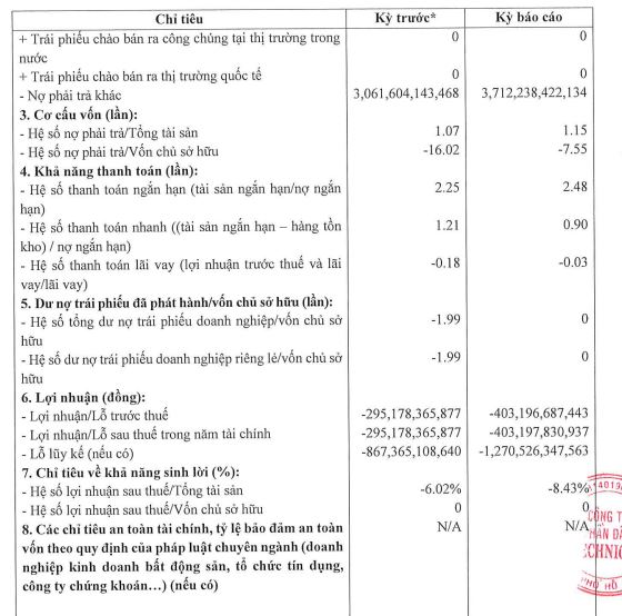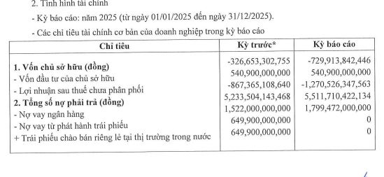 Thậm chí tại Công ty cổ phần Đầu tư Technical (Đầu tư Technical) lỗ sau thuế chưa phân phối lên tới hơn 1.270 tỷ đồng, trong khi năm 2024 chỉ lỗ hơn 867 tỷ đồng. Tính đến 31/12/2025, vốn chủ sở hữu của doanh nghiệp này âm gần 730 tỷ đồng. Nợ phải trả hơn 5.511 tỷ đồng. Trong đó, nợ vay ngân hàng hơn 1.799 tỷ đồng. Đặc biệt, hệ số nợ phải trả/vốn chủ sở hữu âm 7,55 lần; hệ số nợ phải trả/tổng tài sản gấp 1,15 lần.