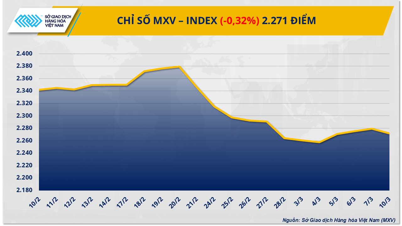 Sở Giao dịch Hàng hóa Việt Nam (MXV) cho biết sau ba phiên phục hồi, đóng cửa ngày hôm qua, lực bán chiếm ưu thế đã kéo chỉ số MXV-Index giảm 0,32% xuống mức 2.271 điểm.