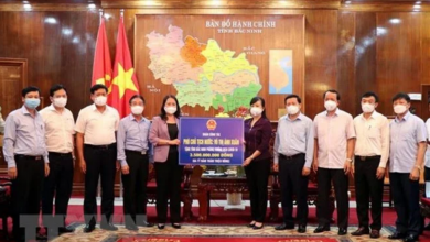 Phó Chủ tịch nước Võ Thị Ánh Xuân trao tiền ủng hộ tỉnh Bắc Ninh phòng, chống dịch COVID-19. (Ảnh: Thái Hùng/TTXVN)