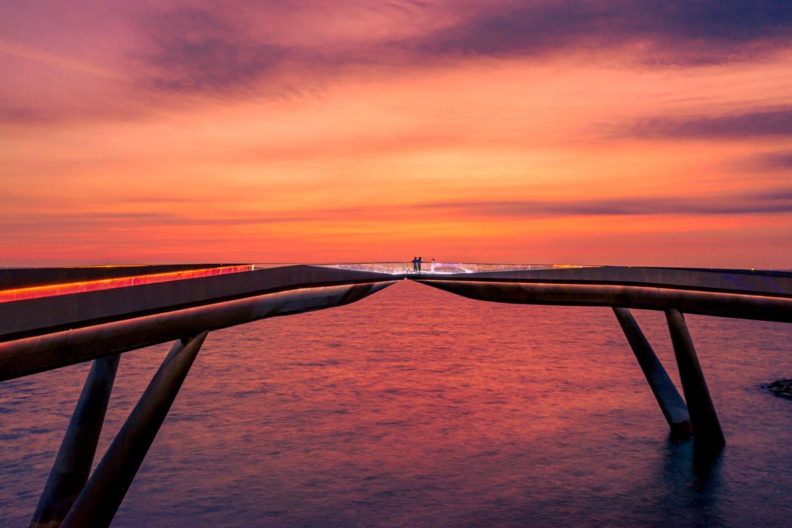 Mà trong đó, điểm đặc biệt nhất trong thiết kế chính là 2 nhánh cầu hợp một thể nhưng không chạm mà cách nhau một khoảng 30 cm. Khoảng cách biểu tượng ấy sẽ chỉ được kết nối nếu hai người chủ động vươn tay ra để bắt tay, trao một cái ôm hay chủ động rướn người để trao cho nhau một nụ hôn. Vì thế không phải ngẫu nhiên, Cầu Hôn khiến ta gọi tên là điểm đến của những cặp tình nhân, bởi trong ánh hoàng hôn tuyệt đẹp khi chiều buông trên biển, những nụ hôn ngọt ngào của các cặp đôi trao nhau từ hai phía nhánh cầu, tạo nên một khung cảnh vô cùng lãng mạn.