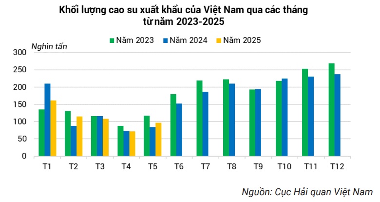 Theo ước tính của Cục Hải quan, trong 6 tháng đầu năm 2025, xuất khẩu cao su của Việt Nam đạt khoảng 680.000 tấn, trị giá 1,27 tỷ USD, giảm 6,5% về lượng nhưng tăng tới 14,4% về trị giá so với cùng kỳ năm 2024. Giá bình quân xuất khẩu đạt 1.865 USD/tấn, tăng mạnh 22,4%, cho thấy xu hướng chuyển dịch từ cạnh tranh theo sản lượng sang cạnh tranh theo chất lượng và giá trị gia tăng. Đáng chú ý, trong tháng 6/2025 riêng lẻ, xuất khẩu đạt 130.000 tấn, tăng 33,5% so với tháng trước nhưng vẫn thấp hơn cùng kỳ năm ngoái 15,6% về lượng và tăng trưởng ngắn hạn đang phụ thuộc nhiều vào biến động giá hơn là mở rộng thị phần.