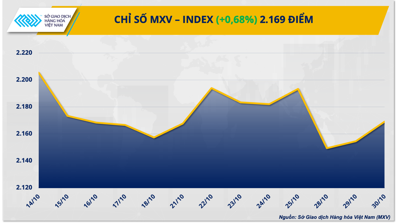 Sở Giao dịch Hàng hóa Việt Nam (MXV) cho biết sắc xanh tiếp tục chiếm ưu thế trên bảng giá hàng hóa nguyên liệu thế giới trong phiên giao dịch hôm qua (30/10).
