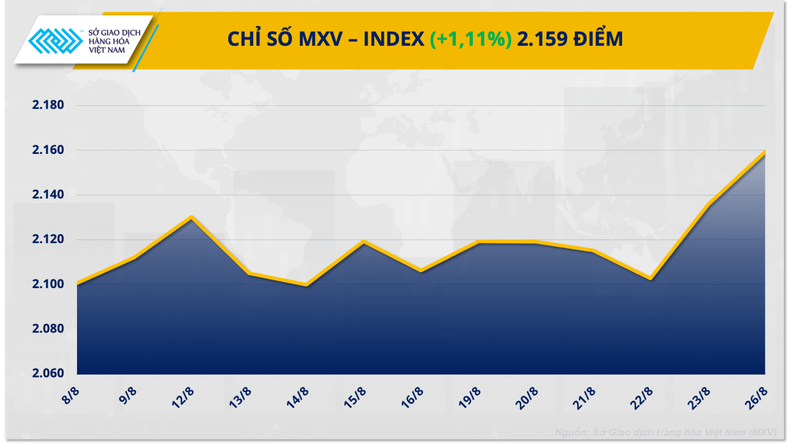 Theo Sở Giao dịch Hàng hóa Việt Nam (MXV), dòng tiền đầu tư tấp nập chảy vào thị trường hàng hóa nguyên liệu thế giới trong ngày giao dịch đầu tuần (26/8). Lực mua mạnh diễn ra ở các nhóm hàng chủ lực. Trong đó, nhóm năng lượng và nguyên liệu công nghiệp dẫn dắt xu hướng của toàn thị trường với nhiều mặt hàng tăng giá. Đóng cửa, chỉ số MXV-Index tăng th&ecir