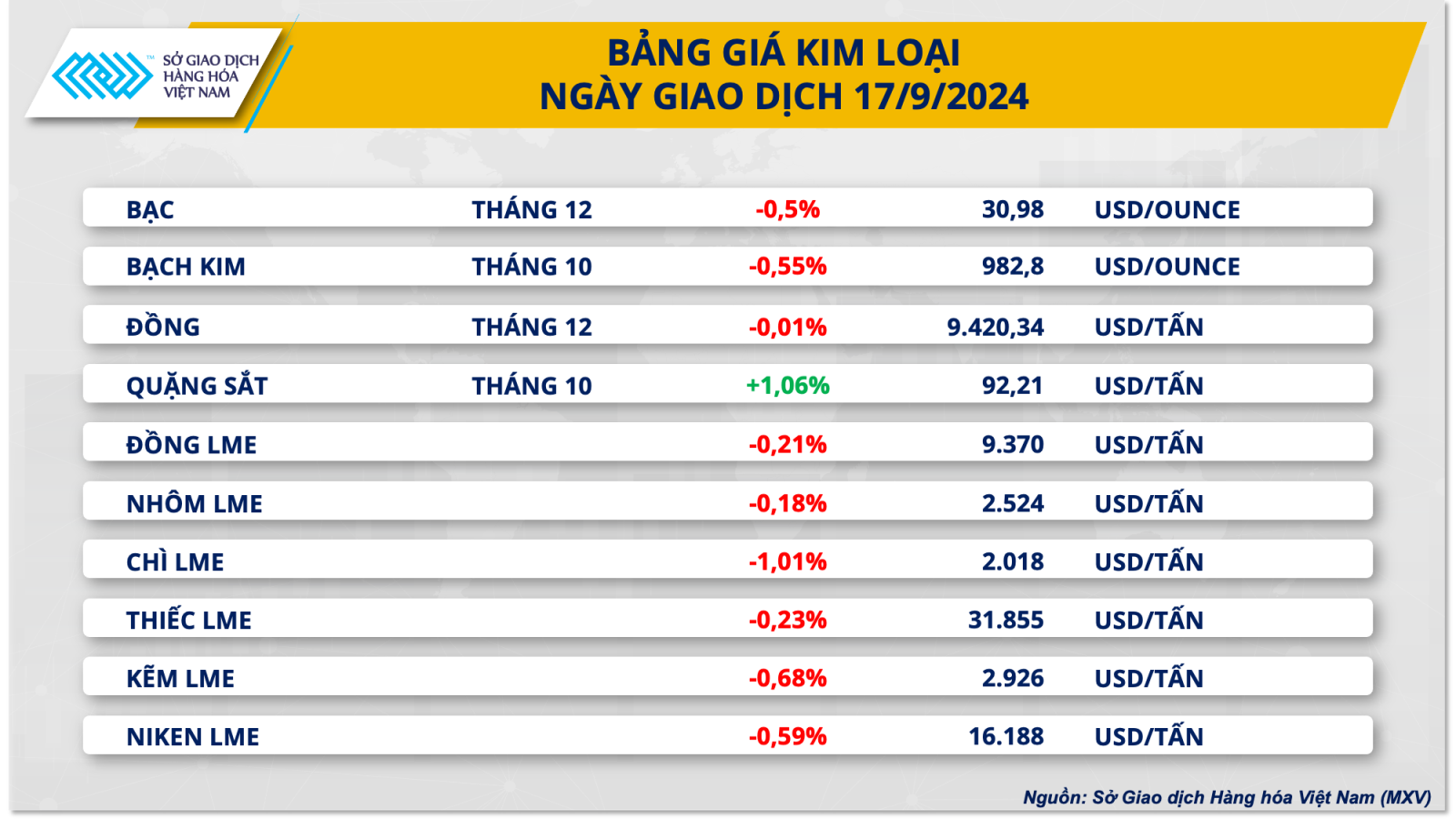 Theo MXV, đóng cửa phiên giao dịch 17/9, ngoại trừ quặng sắt, tất cả các mặt hàng kim loại đồng loạt giảm giá do thị trường đang thận trọng trước kế hoạch cắt giảm lãi suất của Cục Dự trữ Liên bang Mỹ (FED). Đối với kim loại quý, giá bạc quay đầu giảm nhẹ 0,5% xuống 30,97 USD/ounce, kết thúc chuỗi tăng ba phiên liên tiếp. Giá bạch kim cũng tiếp đà giảm với mức giảm 0,55% xuống 982,8 USD/ounce.