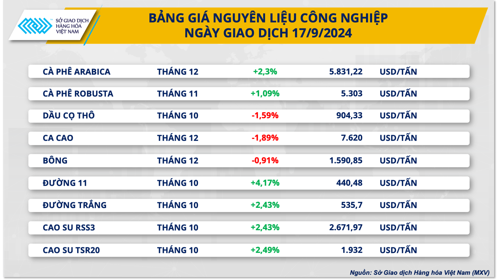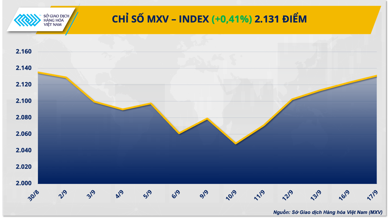 Sở Giao dịch Hàng hóa Việt Nam (MXV) cho biết dòng tiền đầu tư tiếp tục chảy vào thị trường hàng hóa nguyên liệu trong ngày hôm qua (17/9). Lực mua chiếm ưu thế kéo chỉ số MXV-Index tăng thêm 0,41% lên 2.131 điểm.