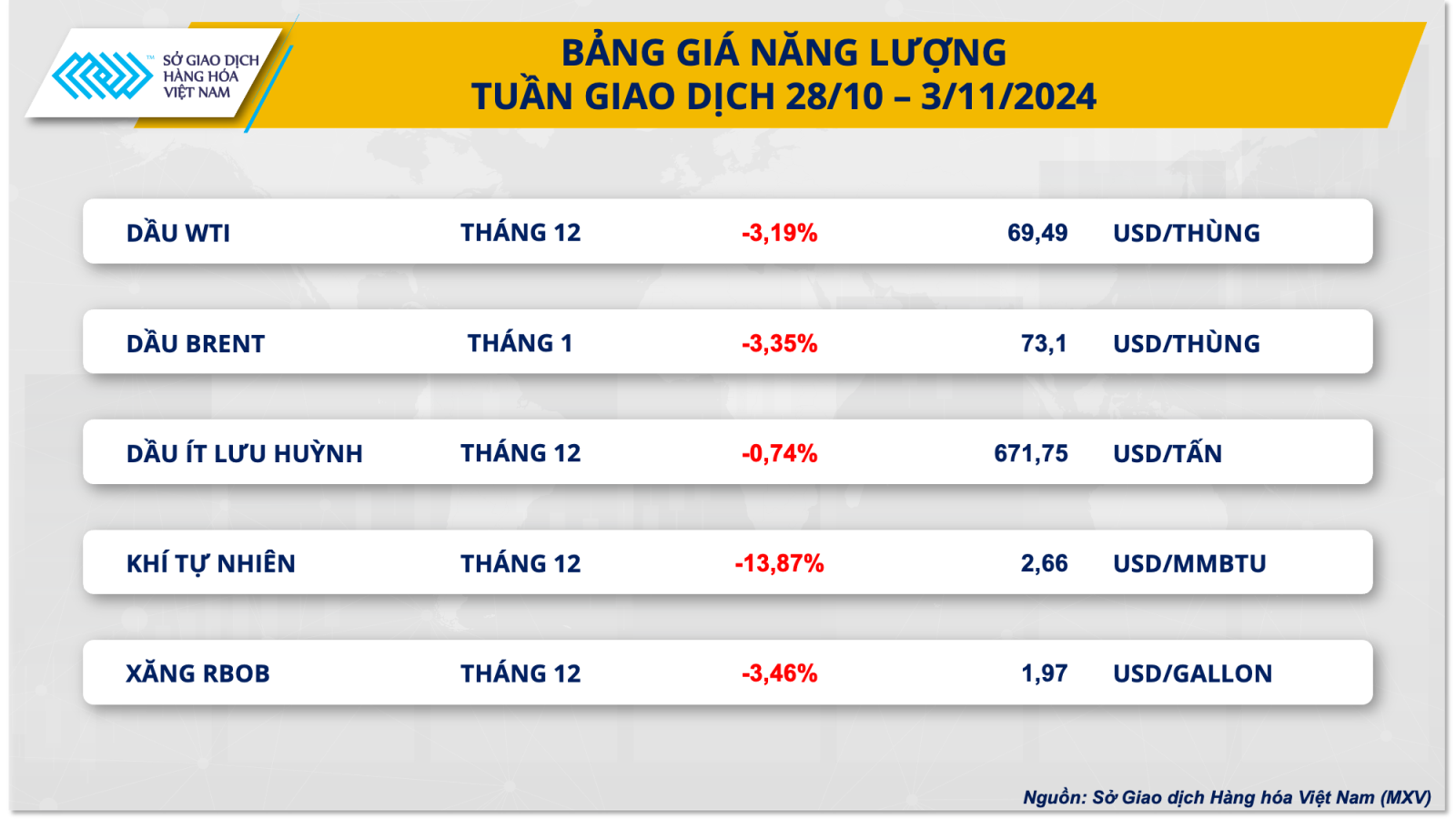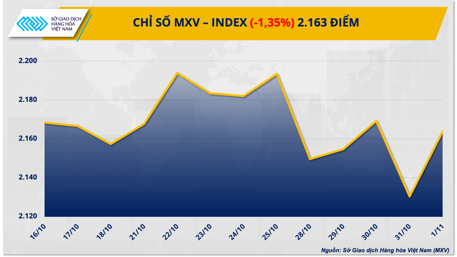 Sở Giao dịch Hàng hóa Việt Nam (MXV) cho biết lực bán áp đảo trên thị trường hàng hóa nguyên liệu thế giới trong tuần giao dịch vừa qua (28/10 - 3/11). Đóng cửa tuần, chỉ số MXV-Index rơi 1,35% xuống 2.163 điểm.