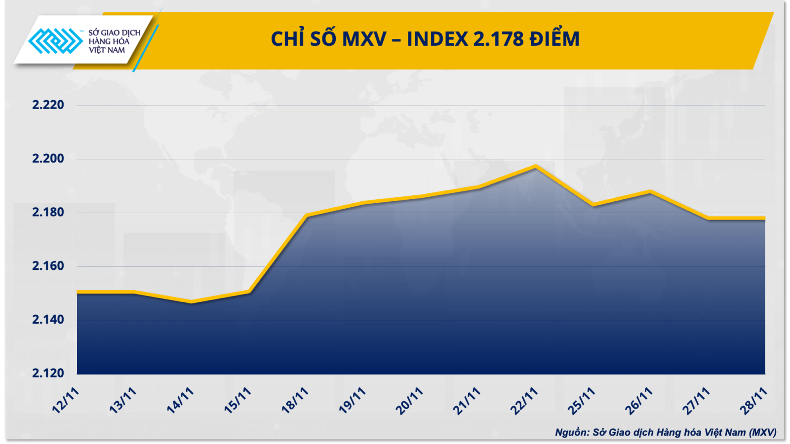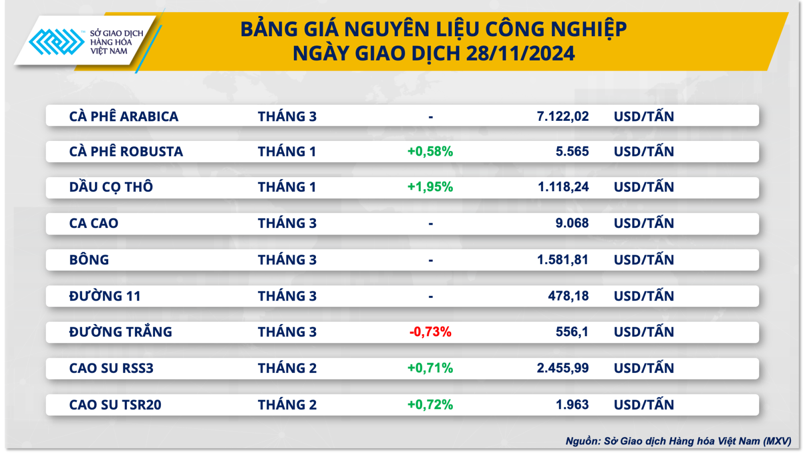 Sở Giao dịch Hàng hóa Việt Nam (MXV) cho biết thị trường hàng hóa nguyên liệu thế giới khá trầm lắng do phần lớn các mặt hàng tạm ngừng giao dịch trong ngày Mỹ nghỉ Lễ Tạ ơn. Nhóm nguyên liệu công nghiệp tiếp tục nhận được sự chú ý của thị trường khi giá của 4 trên 5 mặt hàng giao dịch đều tăng.
