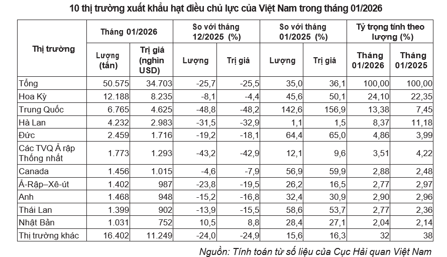 Trong tháng 01/2026, xuất khẩu hạt điều của Việt Nam đạt 50,6 nghìn tấn, trị giá 34,7 triệu USD. So với tháng 12/2025, lượng và trị giá đều giảm khoảng 25%, song so với cùng kỳ tháng 01/2025 lại tăng mạnh, với mức tăng 35% về lượng và 36,1% về trị giá. Diễn biến này cho thấy yếu tố mùa vụ và chu kỳ đơn hàng có thể ảnh hưởng đến so sánh theo tháng, nhưng xu hướng theo năm vẫn duy trì tích cực.