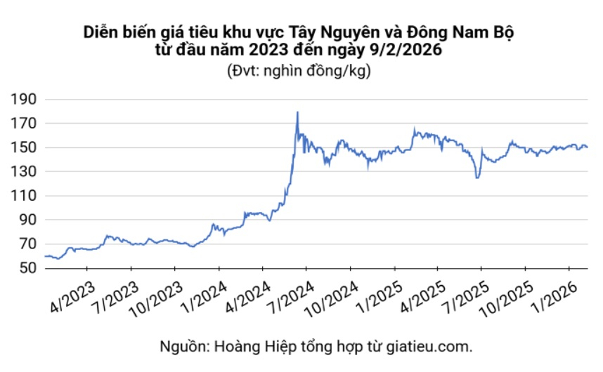 Ghi nhận tại thị trường nội địa ngày 9/2/2026 cho thấy giá hồ tiêu tiếp tục đi ngang trong biên độ hẹp, dao động từ 148.000 đến 150.500 đồng/kg. Mặt bằng giá này được đánh giá là khá cao so với nhiều năm trước, phản ánh thực tế nguồn cung trong nước không còn dồi dào như giai đoạn trước.