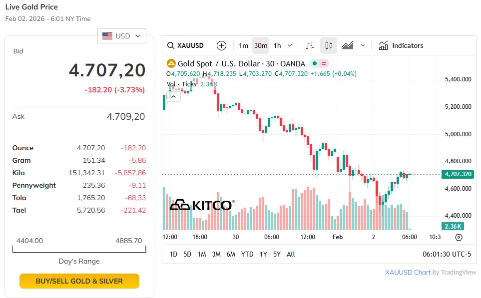 Ghi nhận vào đầu giờ sáng ngày 02/02, giá vàng giao ngay đứng ở mức 4889,4USD/ounce, giảm 486,9 USD so với cùng thời điểm ngày 30/01.