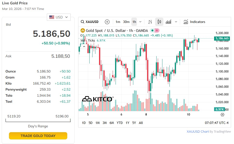 Ghi nhận vào đầu giờ sáng ngày 10/03, giá vàng giao ngay đứng ở mức 5136 USD/ounce, giảm 36 USD so với cùng thời điểm ngày 09/03.