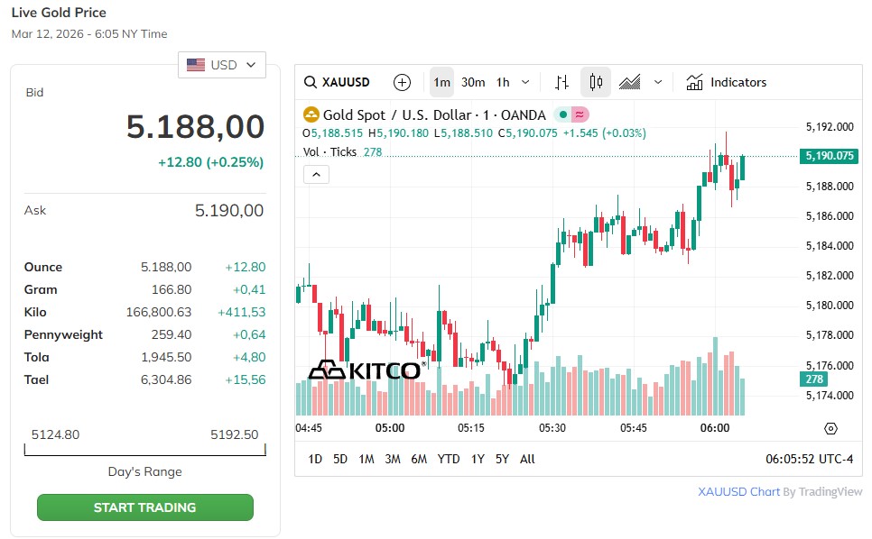 Ghi nhận vào đầu giờ sáng ngày 12/03, giá vàng giao ngay đứng ở mức 5175,2 USD/ounce, giảm 15,1 USD so với cùng thời điểm ngày 11/03.