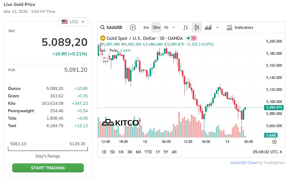 Ghi nhận vào đầu giờ sáng ngày 12/03, giá vàng giao ngay đứng ở mức 5078,4 USD/ounce, giảm 96,7 USD so với cùng thời điểm ngày 12/03.