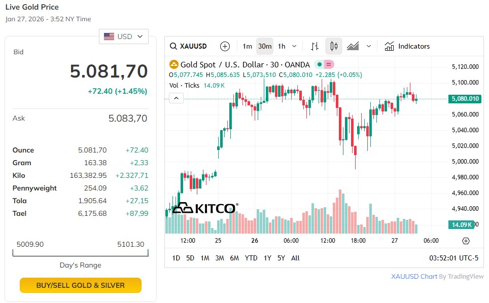 Ghi nhận vào đầu giờ sáng ngày 27/01, giá vàng giao ngay đứng ở mức 5009,3 USD/ounce, tăng 26 USD so với cùng thời điểm ngày 26/01.