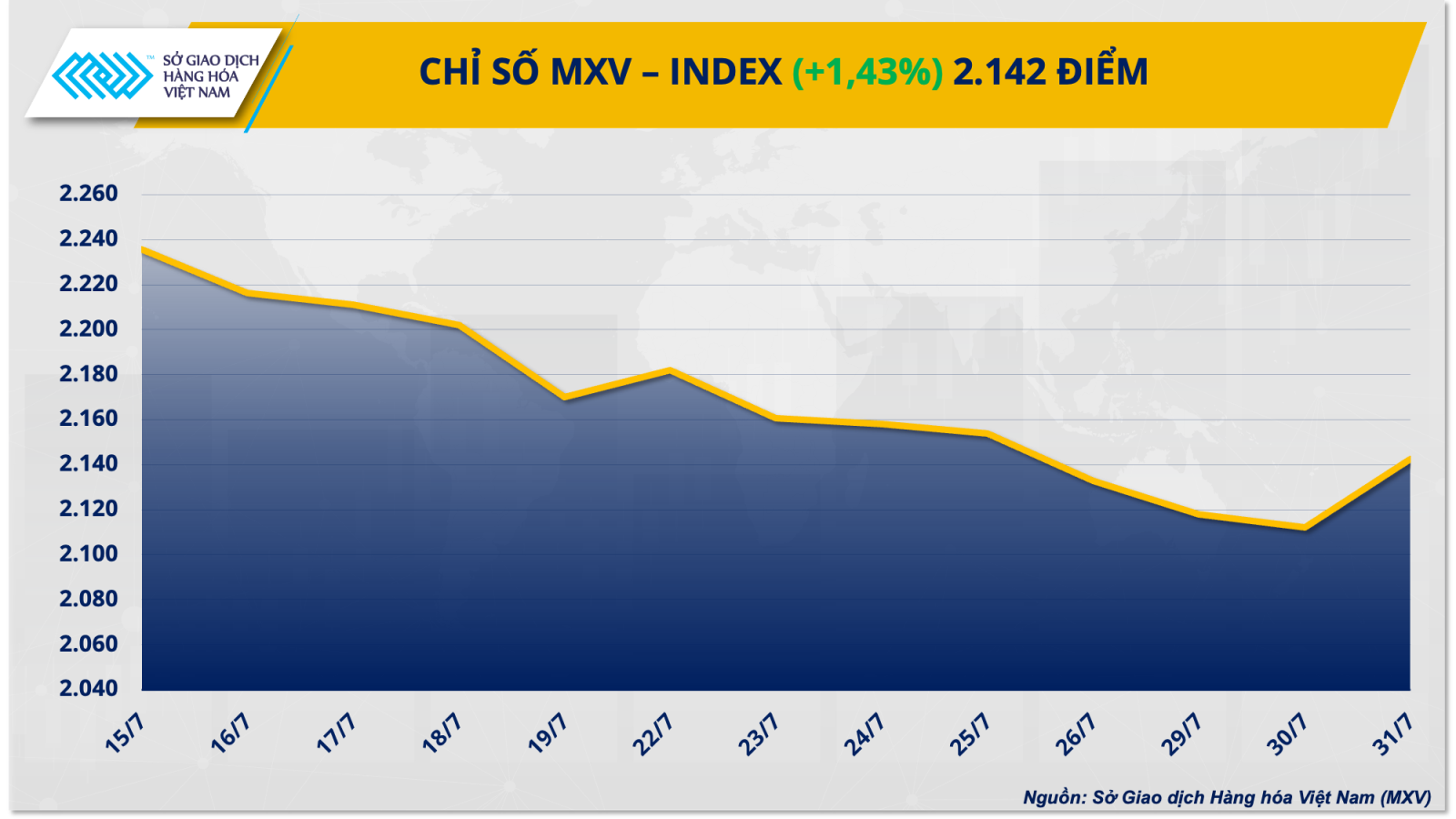 Theo Sở Giao dịch Hàng hóa Việt Nam (MXV), đóng cửa hôm qua (31/7), giá hàng hóa nguyên liệu thế giới đã lấy lại sắc xanh. Trong đó, trên thị trường kim loại và năng lượng, giá các mặt hàng đồng loạt đi lên. Chỉ số MXV-Index bật tăng 1,43% lên 2.142 điểm, chấm dứt nhiều phiên giảm liên tiếp trong tuần cuối tháng 7.