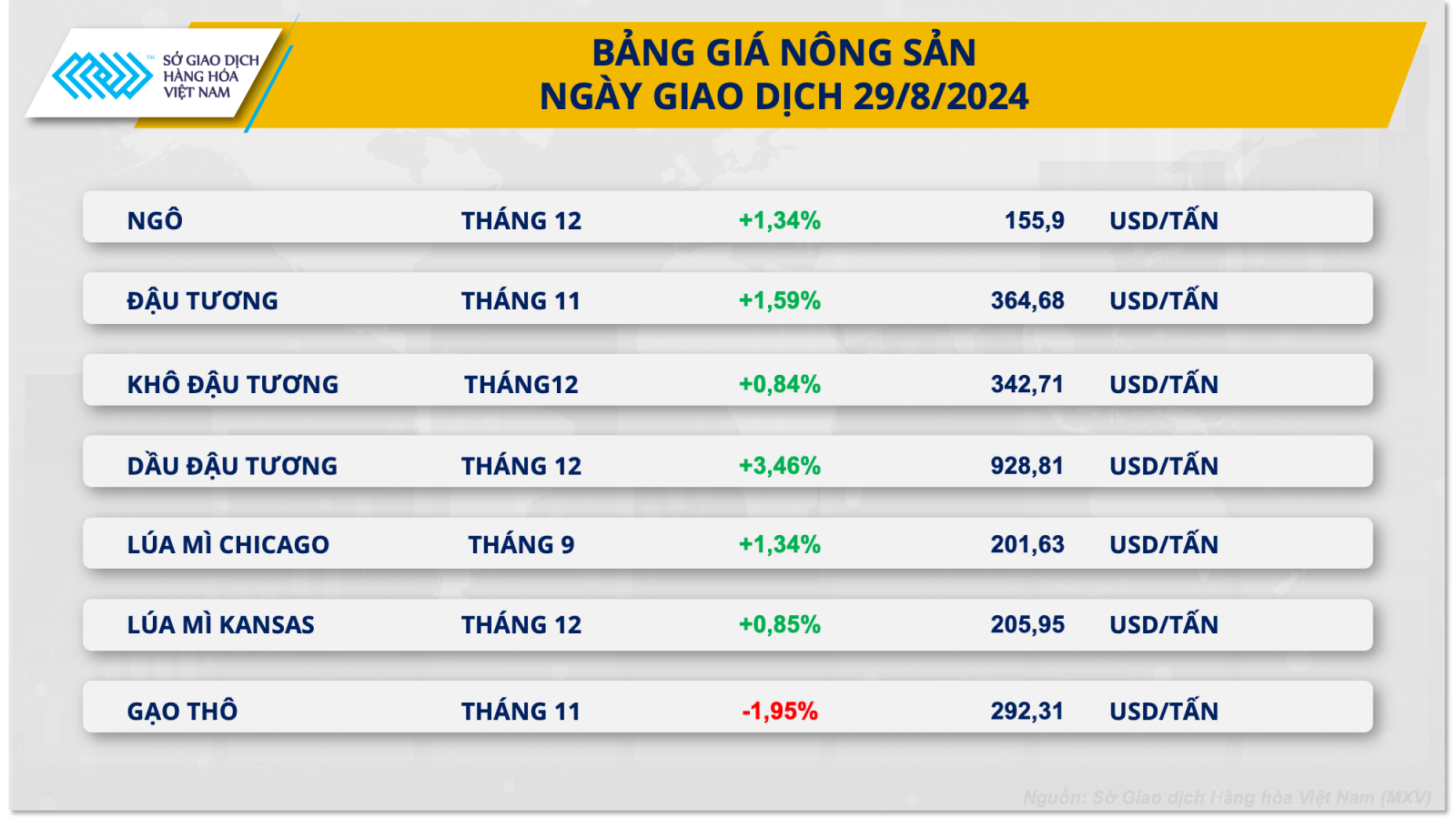 Sắc xanh cũng bao phủ bảng giá hai mặt hàng thành phẩm của đậu tương trong phiên 29/8. Giá khô đậu tương hợp đồng tháng 12 diễn biến khá giằng co. Giá khởi sắc ngay sau khi mở cửa và theo sát với diễn biến giá của đậu tương, nhưng nhanh chóng suy yếu vào cuối phiên trước áp lực chốt lời của thị trường. Tuy vậy, giá khô đậu vẫn ghi nhận mức tăng gần 1% sau khi kết phiên. Trong khi đó, dầu đậu tương là mặt hàng tăng mạnh nhất cả nhóm trong phiên hôm qua với mức tăng lên tới 3,46%.