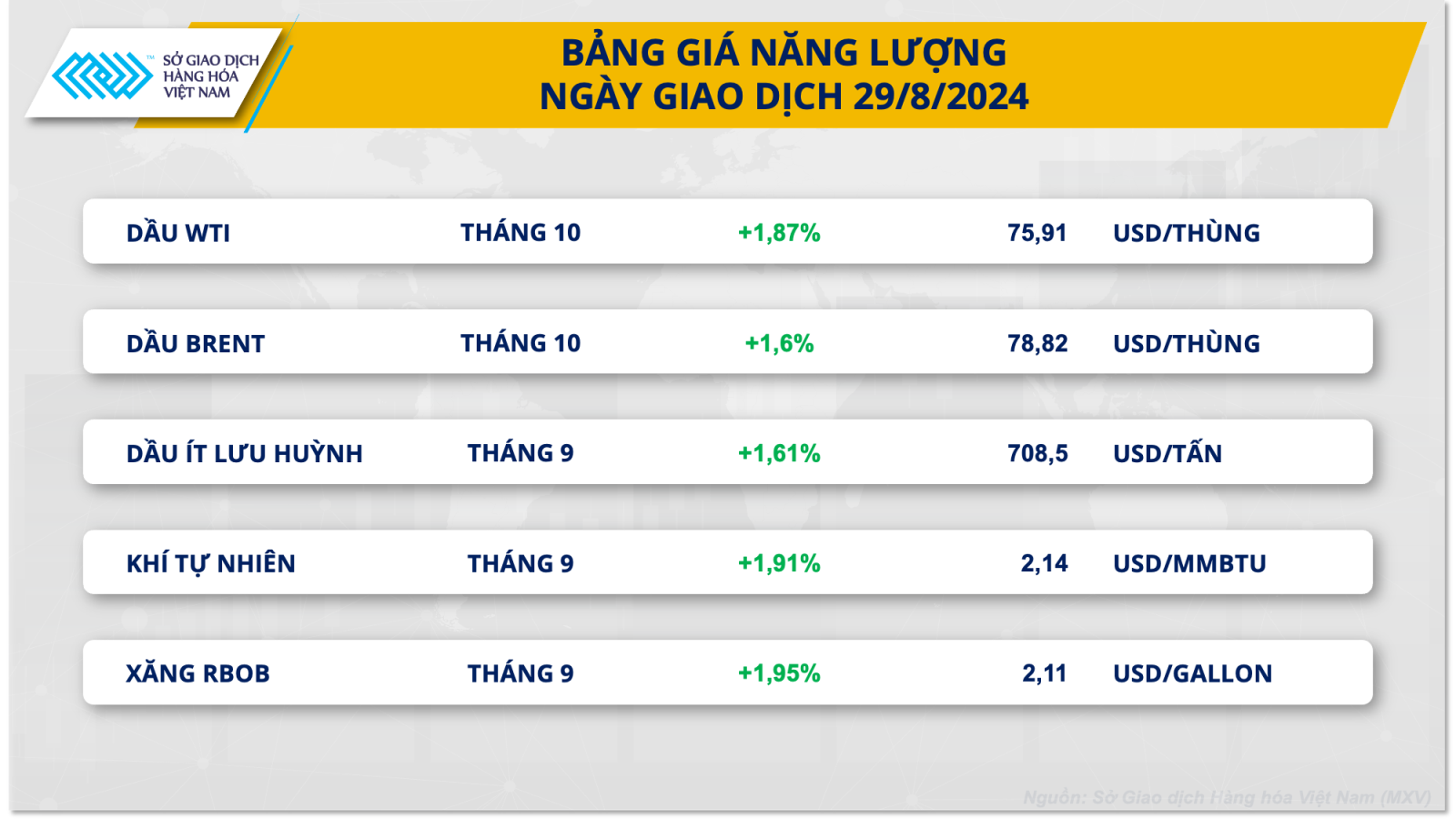 Sở Giao dịch Hàng hóa Việt Nam (MXV) cho biết thị trường năng lượng và nông sản rực rỡ sắc xanh trong phiên giao dịch hôm qua (29/8). Giá dầu bật tăng trong bối cảnh nguồn cung tại Libya bị gián đoạn kéo dài trong khi Iraq chuẩn bị cho kế hoạch cắt giảm sản lượng vào tháng 9.