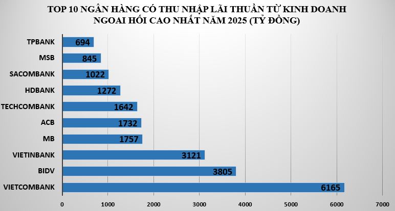 Năm 2025, Vietcombank tiếp tục duy trì vị thế dẫn đầu mảng kinh doanh ngoại hối, trong khi MB vươn lên xếp trên ACB trong nhóm ngân hàng cổ phần.