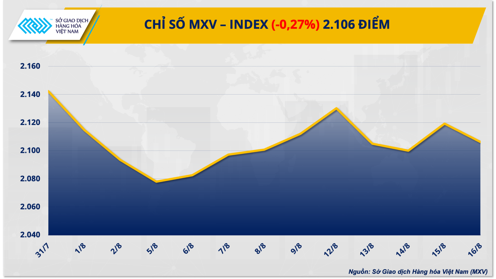 Theo Sở Giao dịch Hàng hóa Việt Nam (MXV), lực bán áp đảo trong tuần giao dịch vừa qua (12-18/8) kéo chỉ số MXV-Index rơi 0,27% xuống 2.106 điểm. Thị trường nông sản dẫn dắt xu hướng đi xuống của thị trường khi toàn bộ 7 mặt hàng đều chìm trong sắc đỏ.