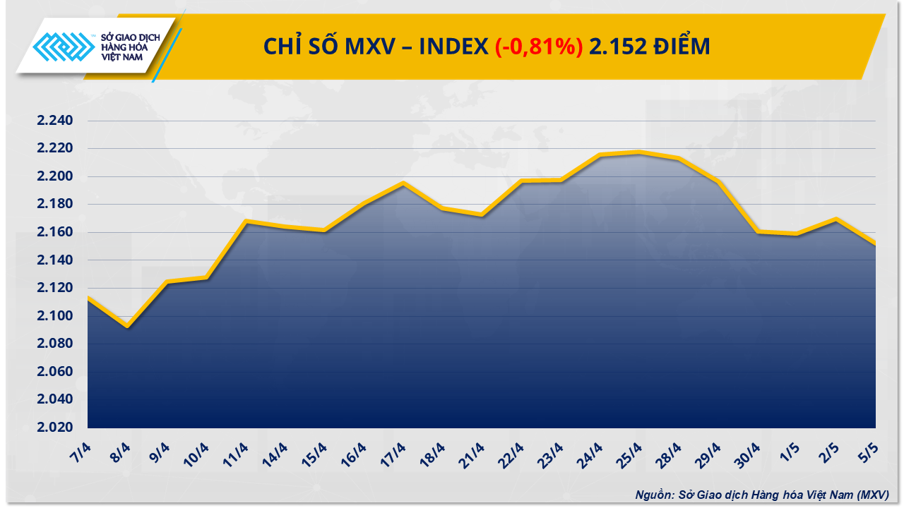 Trong đó, nhóm nông sản chịu áp lực giảm mạnh nhất, nổi bật là mặt hàng ngô với ba phiên liên tiếp giá suy yếu. Bên cạnh đó, giá hai mặt hàng dầu thô cũng tiếp tục lao xuống mức thấp nhất trong hơn 4 năm. Đóng cửa, chỉ số MXV-Index giảm 0,8% về mức 2.152 điểm.