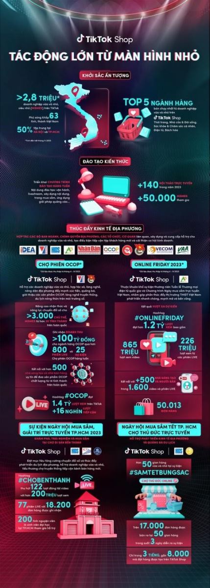 Trong năm vừa qua, TikTok Shop cũng là đối tác tin cậy của nhiều cơ quan chính phủ khi đồng hành trong nhiều chương trình ý nghĩa. Điển hình, chương trình Chợ Phiên OCOP hợp tác cùng Trung tâm Xúc tiến Thương mại Nông nghiệp - Bộ Nông nghiệp và Phát triển Nông thôn, và Ban Thanh niên nông thôn - Trung ương Đoàn ghi nhận doanh thu 100 tỷ đồng với 800 phiên LIVE, giới thiệu và quảng bá nhiều đặc sản, thương hiệu từ các doanh nghiệp vừa và nhỏ, siêu nhỏ địa phương. Các chương trình thúc đẩy mua sắm kết hợp giải trí trực tuyến như Online Friday phối hợp Bộ Công thương; Khám phá, trải nghiệm và mua sắm tại chợ di sản Bến Thành, Chợ Thủ Đức trực tuyến hợp tác cùng UBND TP. Hồ Chí Minh cho thấy nhiều kết quả đáng khích lệ. Cùng với các Bộ ban ngành, các cơ quan điều hành và chuyên môn, TikTok, với lợi thế nền tảng mua sắm - giải trí tiên phong, đã mang đến các sáng kiến hỗ trợ các doanh nghiệp vừa, nhỏ và siêu nhỏ, các hộ kinh doanh cá thể... nhằm tích cực thúc đẩy kinh tế, du lịch, xã hội phát triển.