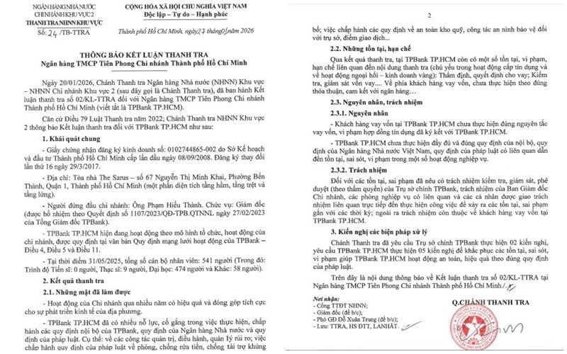 Ngân hàng Nhà nước Việt Nam Chi nhánh Khu vực 2 vừa thông báo kết luận thanh tra đối với Ngân hàng TMCP Tiên Phong Chi nhánh Thành phố Hồ Chí Minh (TPBank TPHCM), qua đó phát hiện các vi phạm, tồn tại trong kỳ thanh tra.