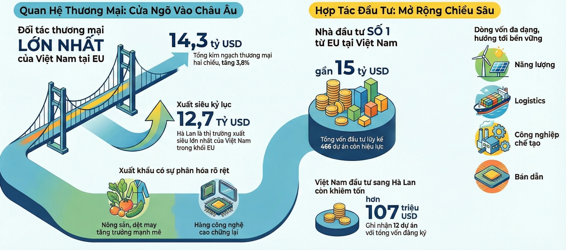 Năm 2025 tổng kim ngạch thương mại hai chiều giữa Việt Nam và Hà Lan đạt 14,3 tỷ USD, tăng 3,8% so với năm trước.