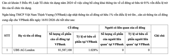 Ngân hàng TMCP Việt Nam Thịnh Vượng (VPBank - Mã: VPB) vừa công bố danh sách cổ đông sở hữu từ 1% vốn điều lệ trở lên, cập nhật đến ngày 16/1. Theo đó, cái tên mới xuất hiện trong danh sách là cổ đông tổ chức UBS AG London. Cổ đông này hiện nắm giữ gần 82 triệu cổ phiếu VPB, tương đương 1,028% vốn điều lệ của ngân hàng.