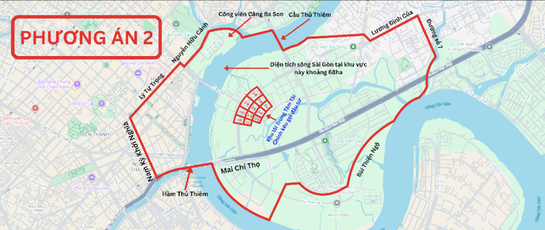 Còn phương án thứ 2 với tổng diện tích khoảng 687 ha, bao gồm các phân khu và diện tích TTTC tại Quận 1 (tương đồng với phương án 1). Phần tại Khu đô thị mới Thủ Thiêm sẽ được bố trí toàn bộ các phân khu chức năng (trừ phân khu 8) với diện tích khoảng 564 ha.