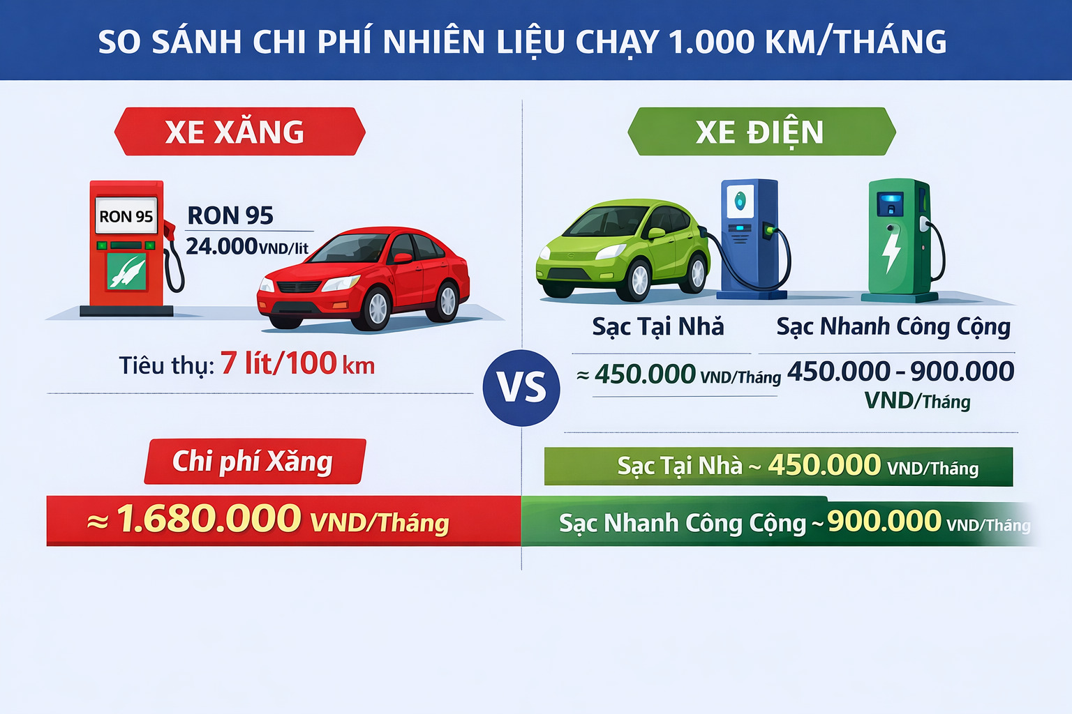 Xe điện: Sự khác biệt rất rõ rệt. Sạc tại nhà: với giá điện sinh hoạt bậc cao nhất hiện nay (~3.000 VND/kWh), nếu xe tiêu thụ trung bình 15 kWh/100km, chi phí mỗi km chỉ khoảng 450 VND. Còn sạc nhanh công cộng: Giá cao hơn, dao động từ 4.500 - 6.000 VND/kWh, tương đương 675 - 900 VND/km. Cùng quãng đường 1.000 km/tháng, người dùng xe điện chỉ tốn từ 450.000 VNĐ đến 900.000 VNĐ cho nhiên liệu.